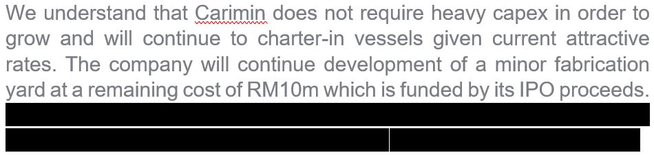 We view the move into sub-sea and underwater works positively as these services generally attract higher margins due to higher operational risks and is a natural extension to Carimin’s existing MCM business. According to PETRONAS’ 2019-2021 Activity Outlook it expects 2-3 campaigns in 2019, followed by 4-5 campaigns in 2020 and 3-4 campaigns in 2021 in the DP2 support vessel (300m for ROV) category. PETRONAS introduced a new groupwide Frame Agreement with a panel of vendors in 2018 which will expire in 2023 of which Subnautica is part of.