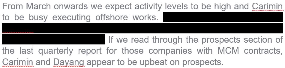 However, the remaining MCM contractors such as Deleum and Petra Energy remain conservative regarding prospects, limiting their enthusiasm to being cautiously optimistic (in Petra’s case) or simply stating intentions to improve financial performance via various initiatives (in Deleum’s case). Overall though, taking cue from Carimin and Dayang’s statements it appears that circumstances and sentiment have turned for the better compared to previous years.