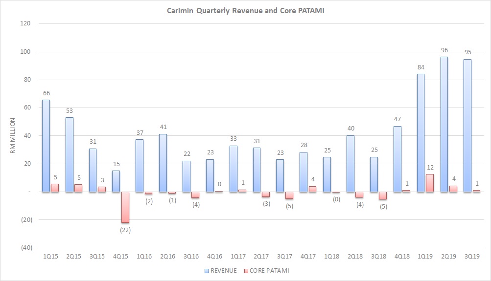 Beginning 1Q19 up til the most recent quarter, Carimin started to exhibit extremely strong y-o-y revenue growth. Revenue was up 340%, 239% and 381% y-o-y in 1Q19, 2Q19 and 3Q19, respectively. This was driven primarily by the HUC segment as well as its supporting maritime services business. In addition, core earnings have remained positive in the last four quarters after posting volatile results previously, with one impressive quarter, 1Q19, which delivered core earnings of RM12m.