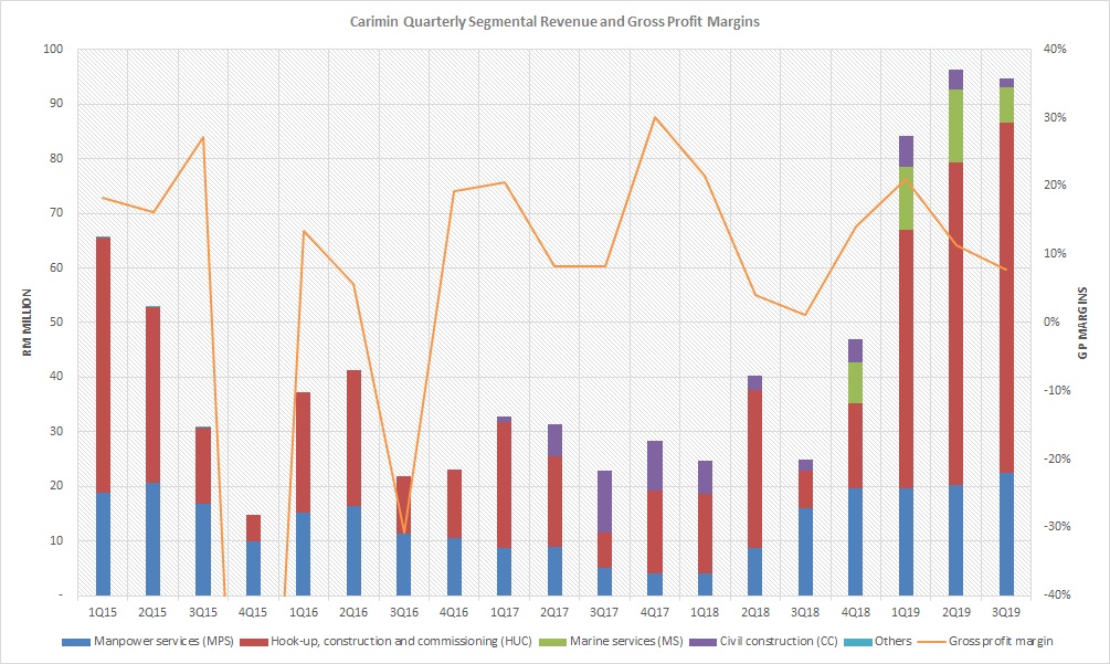Carimin’s gross profit margins are seasonally driven. It peaks in 4Q (April to June) and 1Q (July to September) with the non-monsoon period and recedes in 2Q (October to December) and 3Q (January to March) with the monsoon period. During the monsoon period, the work done is largely onshore, which involves fabrication and preparation for offshore HUC or TMM. Margins are softer during this period because fabrication work is generally on a cost-plus basis and the company’s vessels are not working but manpower, depreciation and maintenance costs are still on-going. During the non-monsoon period, the client will perform scheduled shutdowns which then allows Carimin the opportunity to perform its HUC or TMM works. Offshore works will require a range of services including personnel, installation, workover services, maintenance, repairs and replacement parts and marine vessels. Overall, because of multiple services provided and utilisation of vessels, Carimin’s margins are higher.