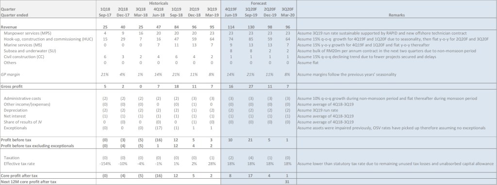 Going forward, we are still very positive for 1Q20, when offshore activities are at its peak and Carimin historically derives its fattest gross profit margins. We understand that for 4Q19 most of the revenue for CHUCTMM was derived from one major shut down. For 1Q20 we expect Carimin to be working on two major shut downs – one was initially supposed to start in June but was postponed to July, whereas another should start towards the end of the quarter.