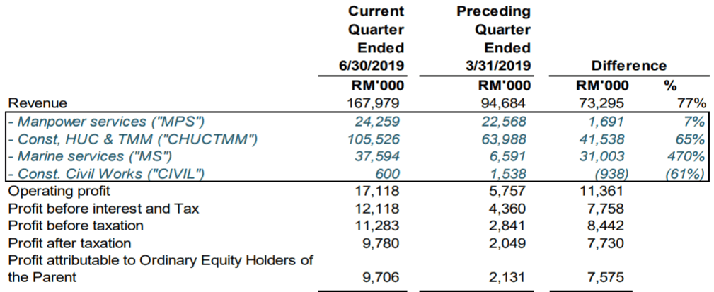 CHUCTMM and MS division showed strong growth due to increased offshore activies and higher utilisation rate for its marine vessels which included a diving support vessel (DSV) for underwater service. Offshore activities increased because of a major shut down whilst the high demand for vessels drove the MS division.